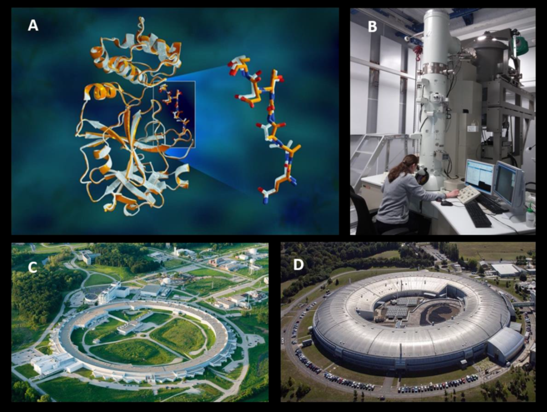 Figure 4: Atomic structure of CoVid-19virus (A), Cryo-electron microscope (B), Advanced Photon Source, Argonne National Laboratory, Argonne, Illinois USA (C), and DIAMOND synchrotron facility in Oxford, England (D). Currently, these two facilities lead the World on CoVid-19 related structural studies.